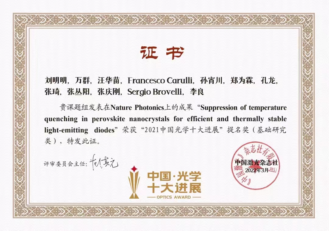 近日,中国激光杂志社发布“2021中国光学十大进展”。经过评审委员会多轮遴选,10项研究入选基础研究类,10项研究入选应用研究类,19项成果获得提名奖。其中,beat365正版唯一官方网站李良教授课题组与合作团队在2021年于Nature Photonics期刊发表的“Suppression of temperature quenching in perovskite nanocrystals for efficient and thermally stable light-emitting diodes”研究论文荣获“2021中国光学十大进展”提名奖(基础研究类)。beat365正版唯一官方网站刘明明博士、万群博士,机械与动力工程学院汪华苗副教授为论文共同第一作者,意大利米兰-比科卡大学Brovelli Sergio教授与李良教授为共同通讯作者。该工作中,通过氟化物后处理钙钛矿量子点的方式,首次实现环境温度处于100℃范围内量子点荧光性能近乎零“热猝灭”,所制备的LED电致发光器件也具有优异的抗“热猝灭”性能。